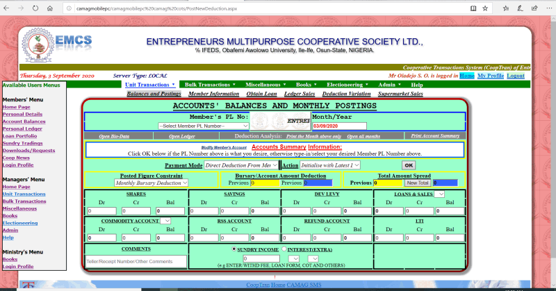 Cooperative Financial Transactions System does not have to be a nest of corruption, it ought to be a network-leverage for Members to climb heights they would never have been able to climb all alone. This Society is out to take care of the drudgery of Book-keeping; so that Decision Makers can have greatest trust from Members, be freed to honestly concentrate on productivity and giving real Values to every Stakeholder of the Society.